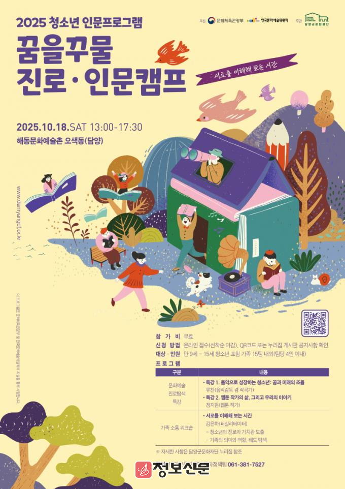![]() 담양군문화재단, 청소년 인문 프로그램 ‘꿈을꾸물 진로인문캠프’ 2회 차 참가팀 모집 |