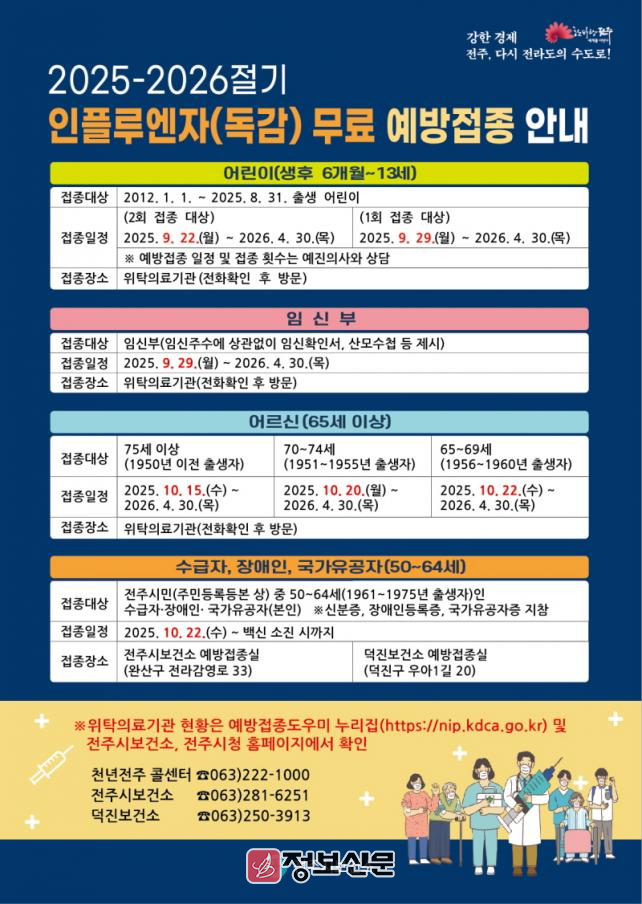 2025-2026 절기 독감 무료 접종 대상자는 △생후 6개월~13세 어린이 및 임신부 △65세 이상 어르신 △50~64세 전주시 취약계층(기초생활수급자와 장애인, 유공자)이다.