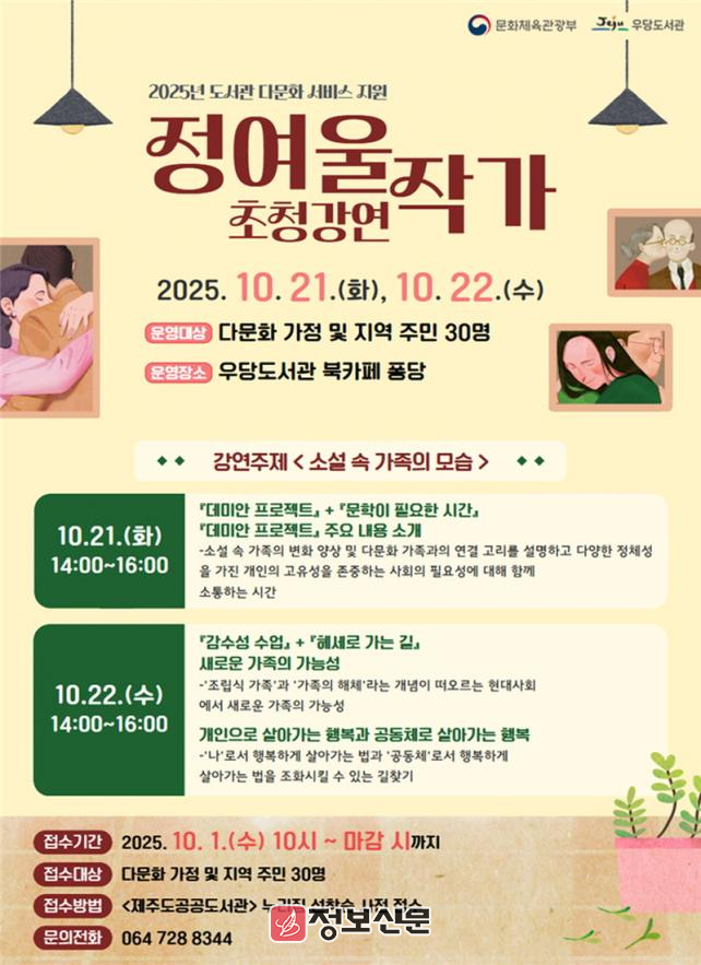 강연 참여를 희망하는 다문화 가정 및 지역 주민은 10월 1일 오전 10시부터 제주특별자치도 공공도서관 누리집(https://www.jeju.go.kr/lib/) ⇨ 프로그램 ⇨ 사전 신청란을 통해 선착순으로 접수하면 된다.
