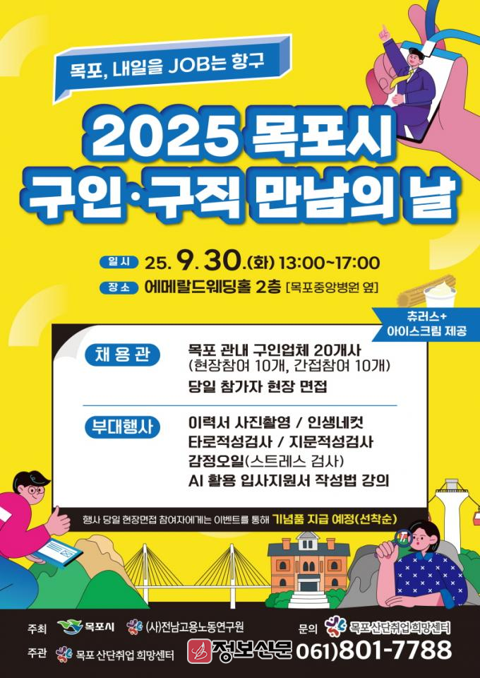 이번 행사는 목포시가 주최하고 (사)전남고용노동연구원이 주관하며, 지역 구인기업 20개사가 참여해 기업 설명회와 현장 면접을 진행한다. 대상은 미취업 청년, 중장년, 경력단절여성 등 연령에 제한이 없는 구직자이며, 취업지원 서비스를 제공하는 소통과 기회의 장이 될 예정이다.