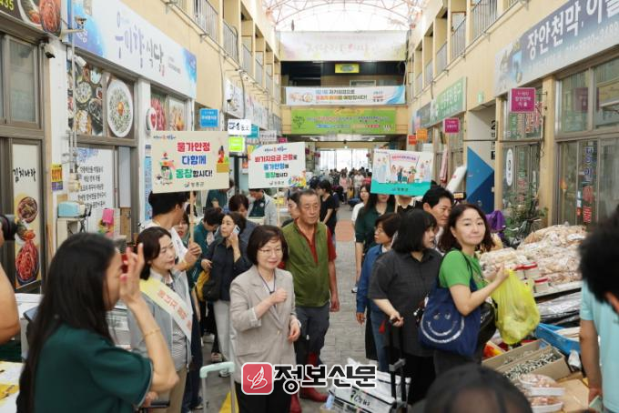 공직자 100여명, 토요시장 상인회 임원 20여명이 함께 참여한 이번 행사는 경기 침체로 어려움을 겪고 있는 전통시장에 활력을 더하기 위해 추진됐다.