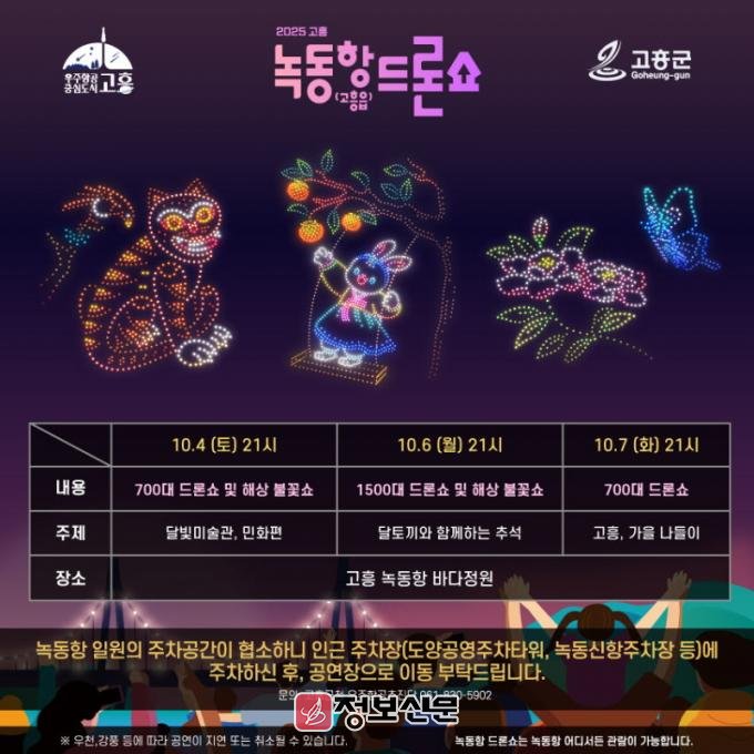 고흥군 녹동항 드론쇼는 오는 10월 25일 폐막식을 앞두고 있으며 강우, 강풍 등 기상 여건에 따라 일정이 변경될 수 있다.