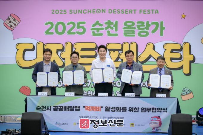 ![]() 순천시, 공공배달앱 ‘먹깨비’ 활성화 민관협력 업무협약식 개최=죄측부터 (주)먹깨비 대표 김주형, 순천시의회 운영위원회 운영위원장 김영진, 순천시장 노관규, 소상공인연합회 전남순천시지부 지부장 고영우, 한국외식업중앙회 전남순천시지부 지부장 박용남