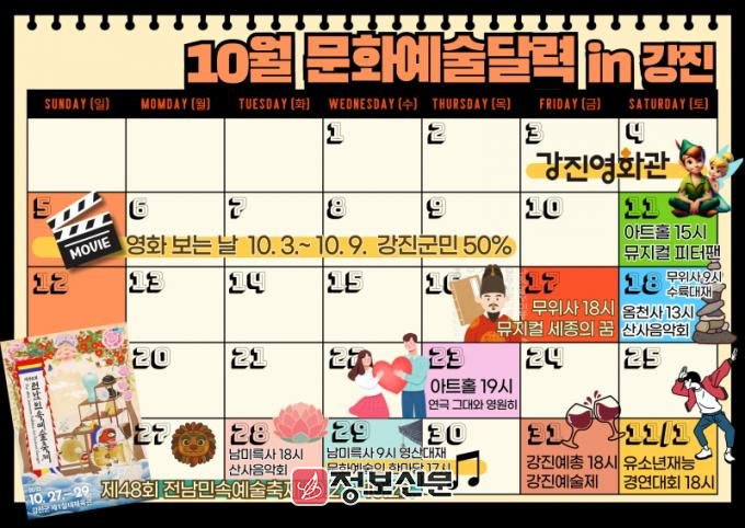 가장 먼저 10월 3일 개천절부터 추석 연휴, 10월 9일 한글날까지 7일간 연속 운영되는 ‘강진영화관 영화보는날’이 진행된다. ‘영화보는날’은 강진군민 대상 전 회차 50% 할인 상영으로, 가족·연인·친구와 함께 문화생활을 즐기며 가을 연휴를 보내기에 안성맞춤이다.