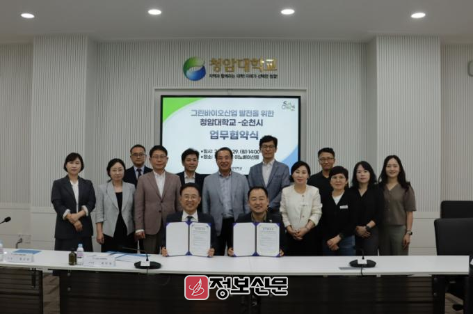 청암대학교는 29일 대학 본관 대회의실에서 순천시와 그린바이오 산업 발전과 전문인력 양성 등을 위한 업무협약(MOU)을 체결했다. 협약식에는 김성홍 총장직무대행, 김재빈 순천시 미래산업국장을 비롯해 양 기관 관계자 10여 명이 참석해 학과 신설과 기업 맞춤형 인재 양성 등을 위한 공동 협력 방안을 논의했다.