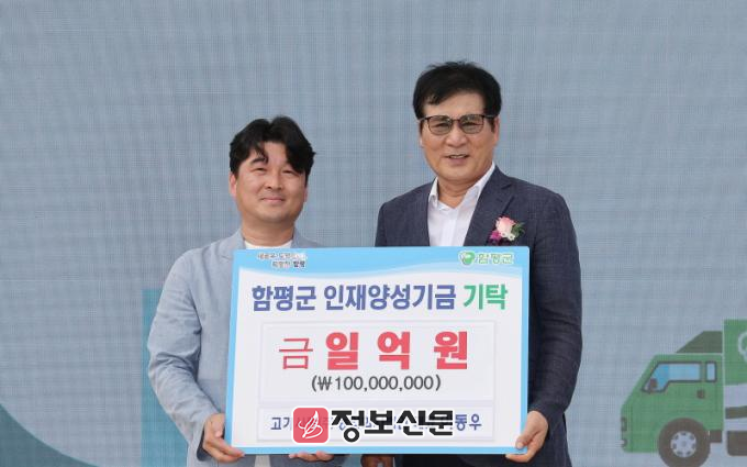함평군은 30일 “고기사랑(주) 농업회사법인 및 함평축산물종합처리장 이동우 대표가 지난 26일 함평자동차극장에서 개최된 ‘함평천지 농촌미래기반 통합 출범식’ 행사 중 인재양성기금에 1억 원을 쾌척했다”고 밝혔다.