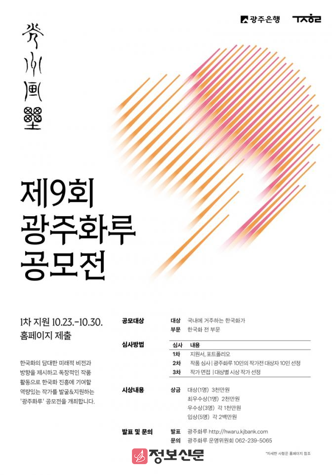 2017년부터 시작해 올해로 9회째를 맞은 ‘광주화루’는 국내 최대 규모의 한국화 공모전으로, 오는 10월 23일부터 30일까지 광주화루 홈페이지(hwaru.kjbank.com)를 통해 온라인 접수를 진행한다.