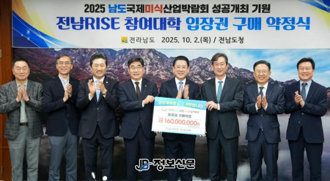 ![]() 김영록 전라남도지사가 2일 도청 접견실에서 전남RISE 참여 대학 총장단과 2025 남도국제미식산업박람회 입장권 구매 약정을 체결하고 있다. |