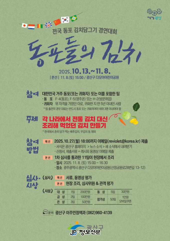참가 대상은 국내 거주 동포(F-4, F-5, H-2 비자 소지자) 또는 귀화자(동포였던 자로 귀화한 지 만 5년 이내인 사람)이며, 개인 또는 팀 단위로 신청할 수 있다. 13일부터 27일까지 전자우편(reviolet@korea.kr)으로 신청서와 김치 조리 과정을 담은 5분 분량의 동영상을 제출하면 된다. 필요 서식은 광산구 누리집 새소식 란에서 확인할 수 있다.