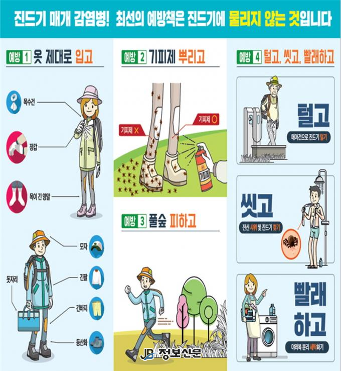 강윤선 공공보건의료과장은 “진드기 매개 감염병 예방을 위해서는 개인별 예방수칙을 준수하고 야외활동 후 발열·구토·설사 증상이 나타나면 의료기관에 방문해 진료를 받을 것”을 당부했다.