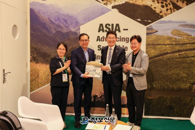 ![]() 지난 9일 아랍에미리트 아부다비에서 노관규 순천시장이 딘도 캄필란(Dindo Campilan) IUCN 아시아지역책임자와 양자회담을 갖고 기념사진을 촬영하고 있다(왼쪽부터 정선화 정부협력관, 딘도 캄필란 IUCN 아시아지역책임자, 노관규 순천시장, 황태주 전략기획국장) |