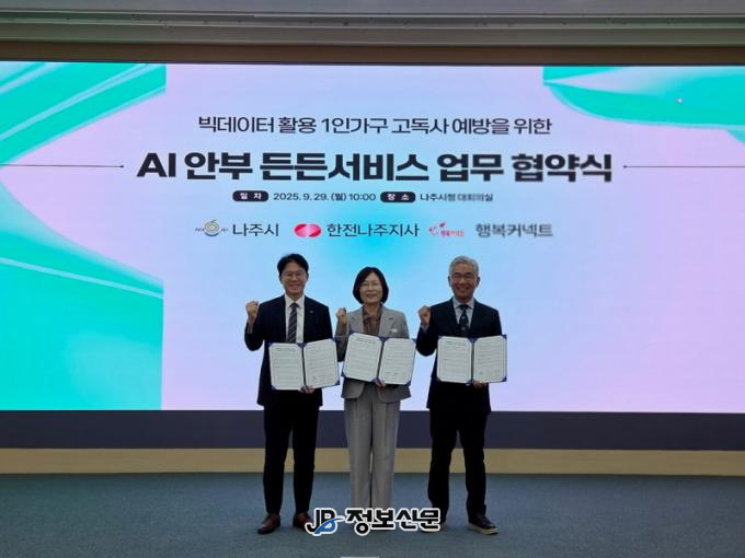 ![]() 나주시가 9월 29일 한국전력공사 나주지사, SK재단법인 행복커넥트와 함께 ‘AI안부 든든서비스’ 3자 업무협약을 체결했다. (사진 제공-나주시)