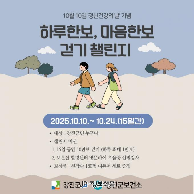 한준호 보건소장은 “걷기는 몸과 마음의 건강을 동시에 지키는 가장 손쉬운 방법으로 이번 걷기 챌린지를 통해 군민들이 정신건강의 중요성을 다시 한번 되새기고, 건강한 생활 습관을 실천하는 계기가 되길 바란다”며 “앞으로도 정신건강 증진을 위한 다양한 프로그램을 지속적으로 운영해 나가겠다”고 말했다.