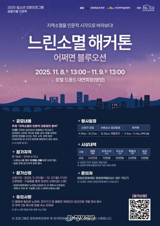 ![]() 담양군문화재단, 청소년 인문 프로그램 「느린소멸 해커톤」 참가팀 모집 |