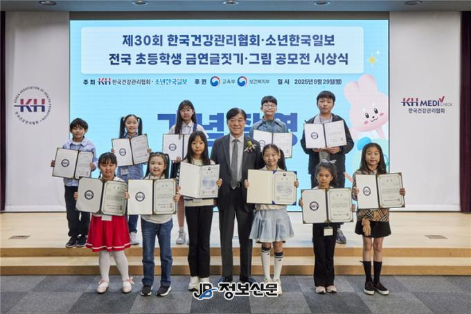 ![]() 제30회 전국 초등학생 금연 글짓기·그림 공모전 수상자들과 김인원 한국건강관리협회 회장