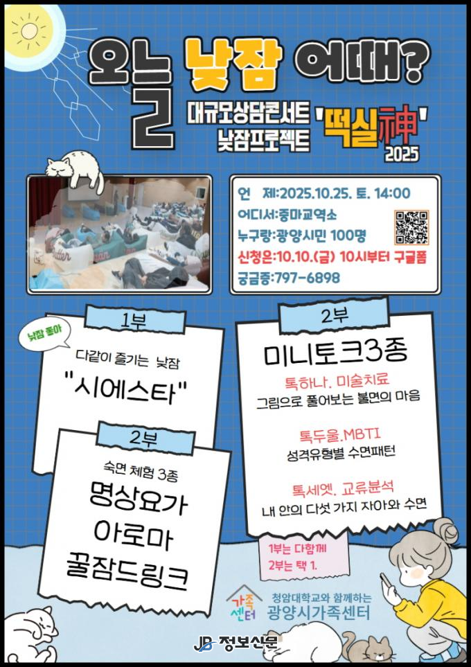 ![]() 광양시가족센터, 대규모 상담콘서트 ‘낮잠 프로젝트 떡실神’ 운영 |