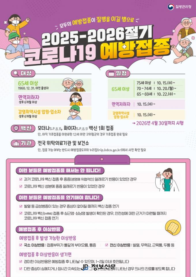 이번 접종은 15일부터 시작되며, 요양병원·요양시설 등 감염취약시설 입원(입소)자와 면역저하자, 75세 이상 어르신을 중심으로 시행한 뒤 20일부터 70~74세, 22일부터 65~69세 순으로 확대된다. 접종대상자는 주소지와 관계없이 전국 위탁의료기관, 보건소에서 신분증을 지참하면 접종 가능하다.