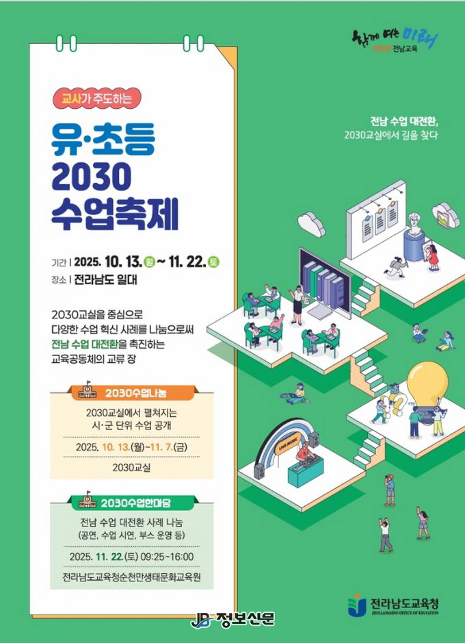 ‘2030수업한마당’은 수업 시연, 공연, 콘퍼런스, 체험 부스 등으로 구성돼 교육공동체가 함께 어우러지는 전남형 수업 축제의 장으로, 초등과 중등으로 나뉘어 다채롭게 펼쳐진다. 유‧초등은 11월 22일 순천만생태문화교육원에서, 중등은 11월 29일 순천삼산중에서 열리며 교원, 학생, 학부모, 교육전문직원 등이 한자리에 모여 전남 수업 대전환의 여정을 공유한다.
