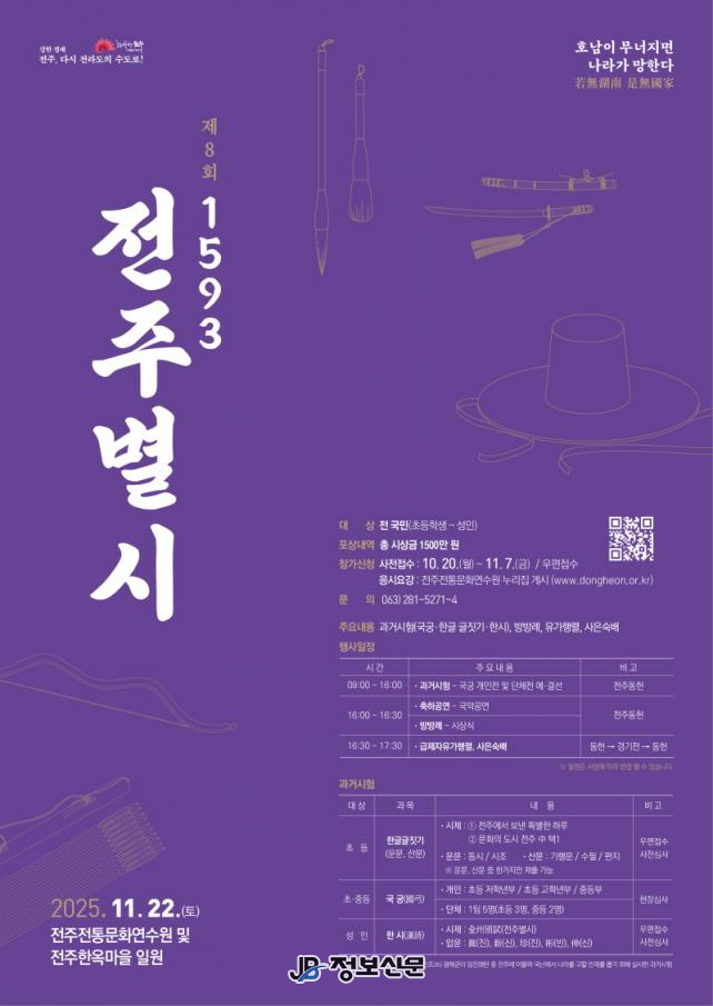 국궁대회 참가 신청 및 한글 글짓기·한시 원고 접수 기간은 오는 20일부터 오는 11월 7일까지이며, 기타 자세한 사항은 전주전통문화연수원 누리집을 참고하면 된다.
