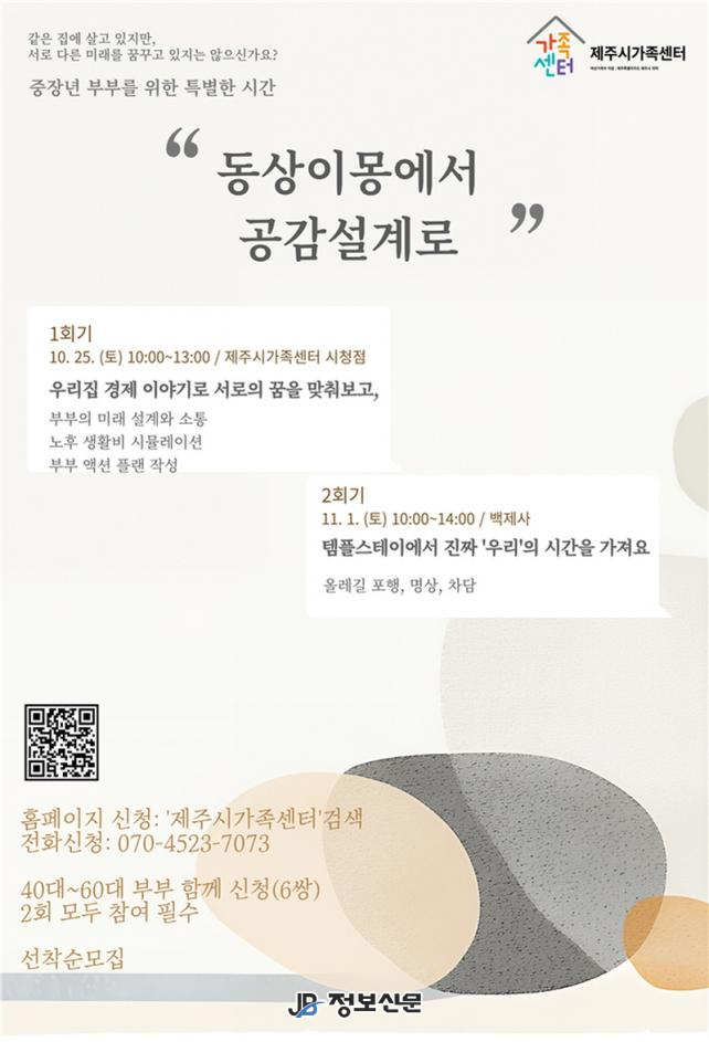 ![]() 제주시, 제주시가족센터와 중장년 부부 미래설계 프로그램 운영 |