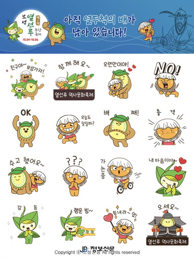 이번 이모티콘 무료 배포는 10월 24일부터 3일 동안 열리는 ‘제1회 보성 열선루 이순신 역사문화축제’를 널리 알리기 위한 것으로, 보성의 대표 특산물인 녹차·꼬막·키위를 의인화한 캐릭터 BS삼총사를 귀엽고 익살스럽게 표현했다.