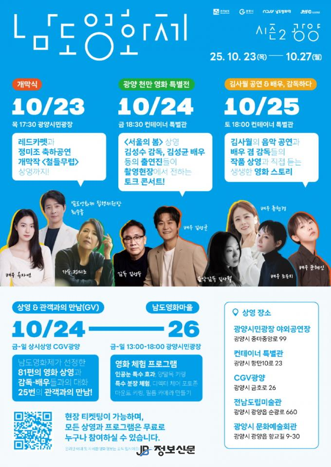 [남도영화제 시즌2 광양]은 10월 23일(목)부터 27일(월)까지 CGV광양, 전남도립미술관, 광양시문화예술회관, 광양시민광장, 컨테이너 특별관(스타인벡코리아 광양항) 등 광양시 일대에서 열린다.