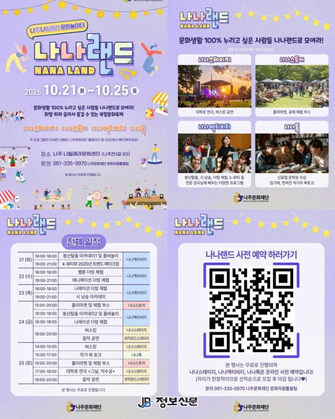 김찬동 나주문화재단 대표이사는 “‘나나랜드’는 시민이 주체가 되어 문화를 함께 만들고 즐기는 축제가 될 것”이라며 “지역의 일상에 문화가 자연스럽게 스며들 수 있도록 시민 중심의 문화예술 프로그램을 지속적으로 추진하겠다”고 말했다.