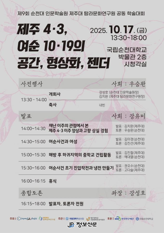 ![]() 국립순천대 인문학술원, 제주 4.3.여순 10.19의 공간.형상화.젠더 공동 학술대회 개최 |