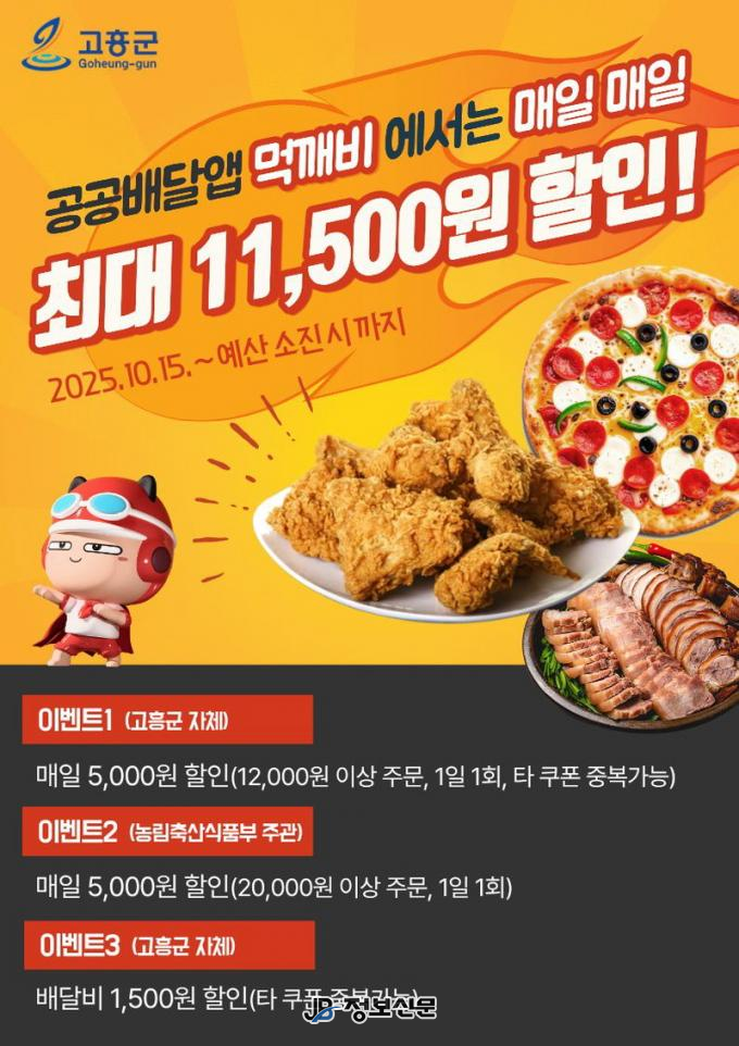 이번 먹깨비 외식비‘반값’ 행사는 고흥군이 ▲매일 5,000원 쿠폰과 ▲배달비 1,500원을 지원하고, 농림축산식품부가 ▲매일 5,000원 할인을 추가로 제공해 최대 11,500원의 할인 혜택을 받을 수 있다.