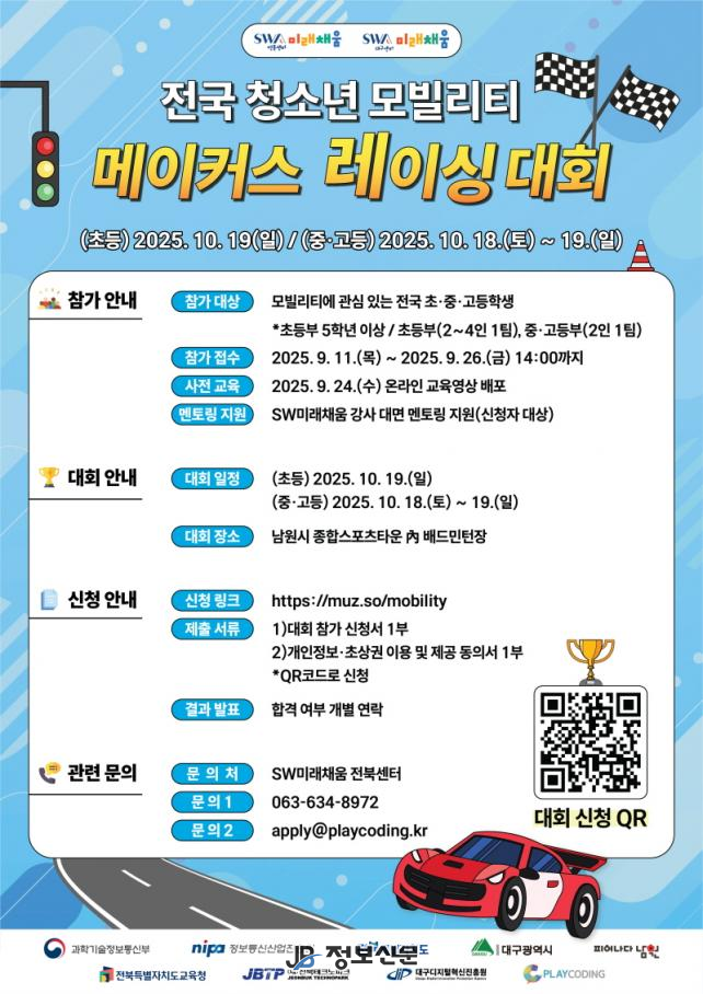 이번 대회는 과학기술정보통신부와 정보통신산업진흥원이 주최하고, SW미래채움 전북센터와 대구센터가 공동 주관하며, 전북특별자치도와 남원시, 전북특별자치도교육청 등이 후원하는 행사이다. 더불어 ‘2025 남원 국제드론제전 with 로봇’과 연계해 미래 모빌리티와 첨단 로봇 기술이 융합된 종합 기술 축제로 진행된다.