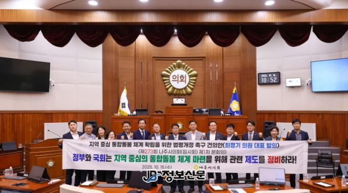 ![]() 나주시의회, ‘지역 중심 통합돌봄 체계 확립을 위한 법령개정 촉구 건의안’ 채택 |