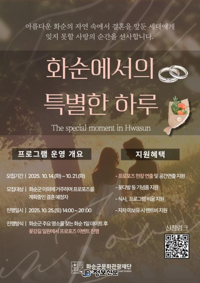 모집은 10월 14일(화)부터 10월 21일(화) 18:00까지로 화순군 외 지역에 거주하며 프로포즈를 계획 중인 커플 1팀을 모집한다. 신청은 별도의 폼 작성을 통한 온라인 접수로 가능하며, 최종선정자는 10월 22일(수) 개별 안내 예정이다.