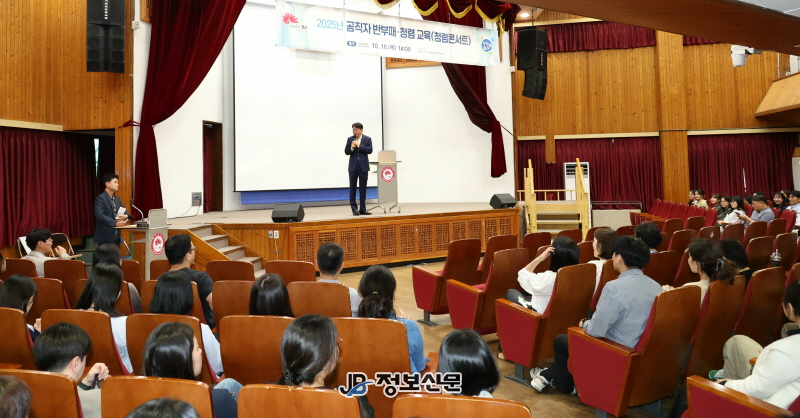 전주시는 16일 시청 강당에서 신규임용자와 2025년도 승진자 등 소속 공무원 300여 명을 대상으로 청렴한 조직문화 조성 및 청렴도 향상을 위한 ‘2025년 청렴 콘서트’ 교육을 실시했다.
