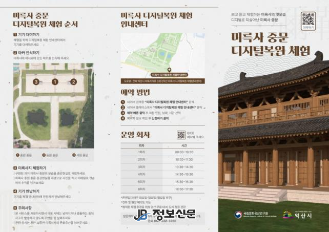 온라인 접수는 네이버에서 '미륵사 디지털 복원 체험 안내센터' 검색 후 예약 누리집에서 하면 된다. 더욱 자세한 내용은 전화(063-838-3755)로 문의하면 안내받을 수 있다.