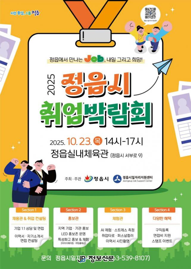 정읍시 일자리지원센터는 오는 23일 오후 2시부터 5시까지 정읍시 실내체육관에서 ‘2025 정읍시 하반기 취업박람회’를 개최한다고 17일 밝혔다.