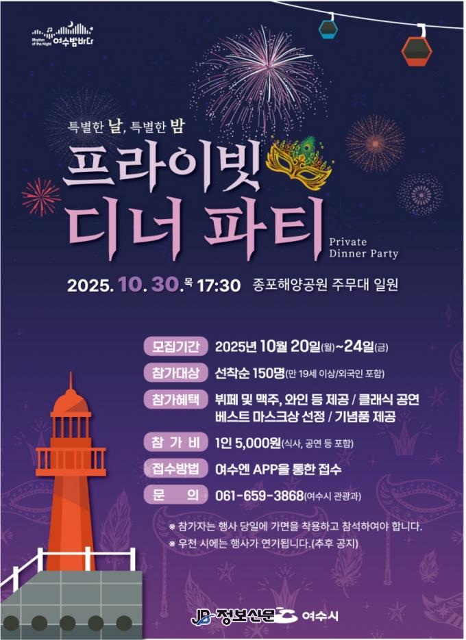 시 관계자는 “작년에 이어 올해도 이색적인 장소에서 시민과 관광객이 함께 낭만 밤바다를 즐길 수 있도록 프라이빗 디너 파티를 준비했다”며 “선선한 가을밤 여수의 매력과 낭만을 즐길 수 있는 이번 행사에 많은 관심과 참여를 바란다”고 전했다.