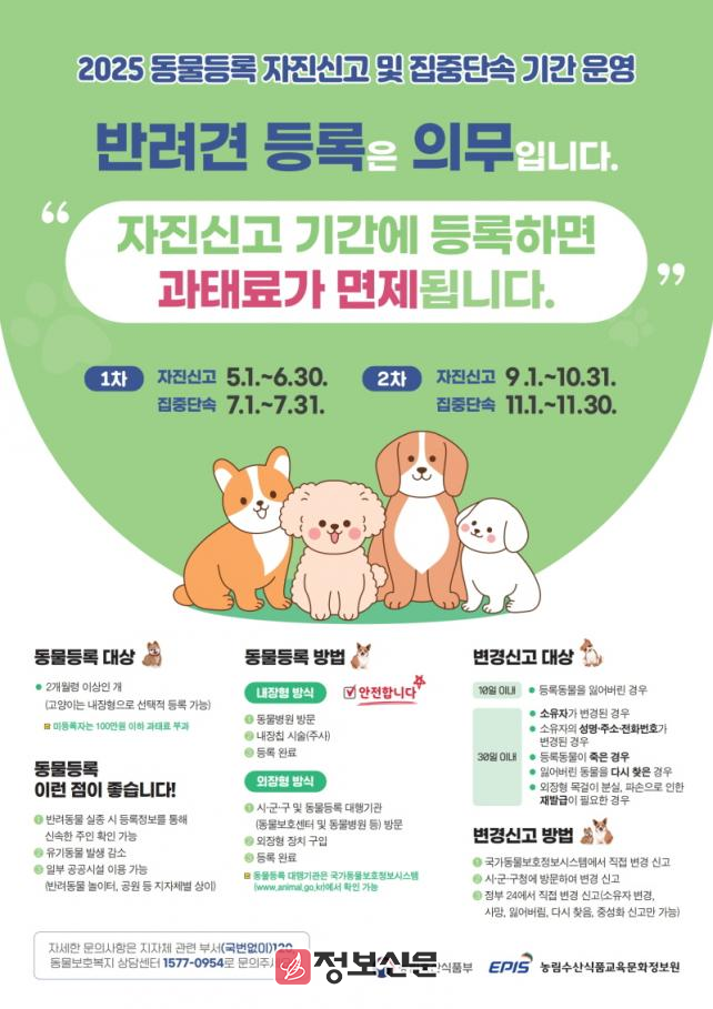 시 관계자는 “오는 11월 정읍천, 근린공원 등 반려동물 산책로 일대에서 집중단속을 진행할 예정”이라며 “아직 동물등록이나 변경신고를 하지 않은 소유자께서는 단속 전 협약 병원을 방문해 지원 사업을 통해 꼭 의무를 이행하시길 바란다”고 말했다.