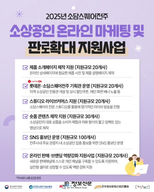 이와 함께 소담스퀘어전주는 소상공인들이 변화하는 온라인 마케팅 환경에 대응하고, 스스로 마케팅 역량을 강화해 자사 제품과 서비스를 효과적으로 홍보할 수 있도록 △숏폼 콘텐츠 제작 지원 △SNS 홍보단 운영 △온라인 판매·브랜딩 역량 강화 지원사업 등도 함께 추진한다.