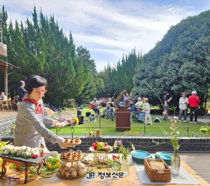 천향백주(天香白酒)는 은목서 향기에 두부, 백설기 맛과 어우러져 잔치 분위기를 한층 올려주었다. ‘여섯 줄의 행복’ 기타 연주의 선율에 꽃송이가 날리고 향기를 휘감았다. 시 낭송, 가을의 가요까지 더하여 환상적인 판타지였다.