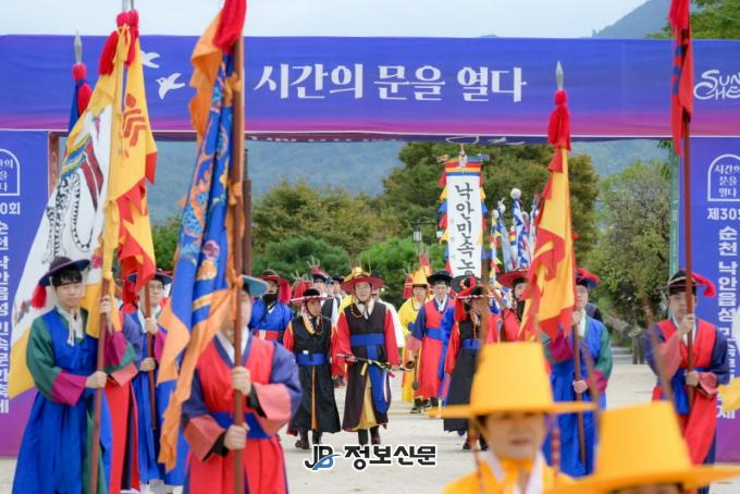 ‘순천 낙안읍성, 시간의 문을 열다’라는 주제로 열린 이번 축제는 17일 오후 낙안군수 부임행렬과 군악대 행진으로 시작됐으며, 조선시대로의 문을 활짝 여는 상징적인 퍼포먼스를 선보인 개막식은 노관규 순천시장을 비롯한 주요 내빈들이 참여한 가운데 진행됐다.