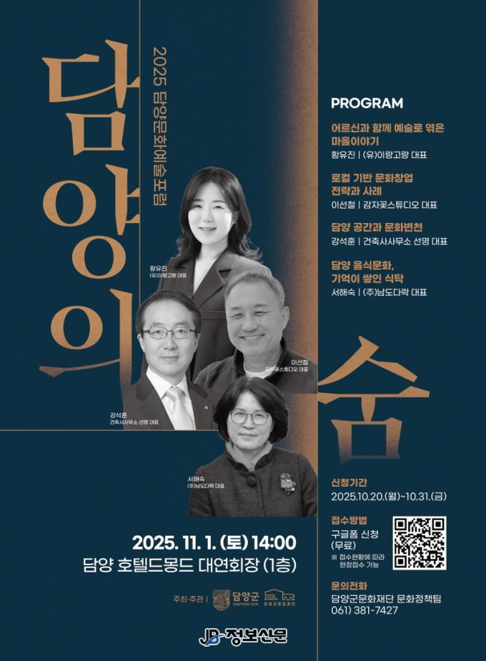 ![]() 담양군, 2025 담양 문화예술포럼 「담양의 숨」 개최 |