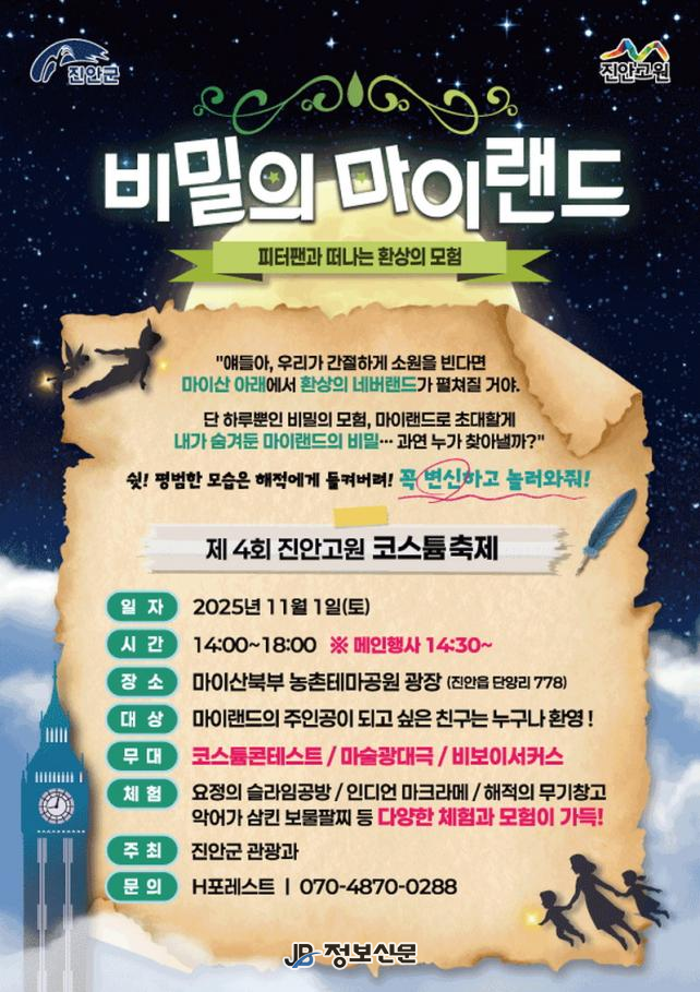 진안군 관계자는 “비밀의 마이랜드 축제는 마이산을 배경으로 펼쳐지는 특별한 코스튬 행사로, 전주·대전 등 인근 시군에서도 해마다 더 많은 분들이 찾아오고 있다”며 “주민과 관광객이 함께 어울려 즐기는 진안만의 신선하고 유쾌한 관광 축제인 만큼, 비밀의 마이랜드에서 특별한 가을날의 추억을 만들어 가시길 바란다”고 전했다.