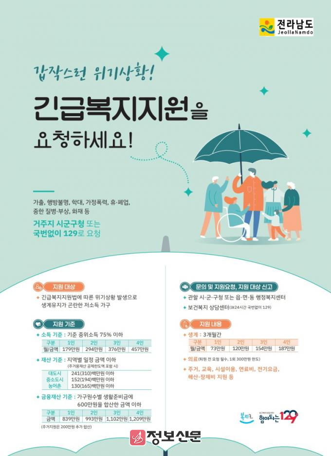 ![]() 전라남도, 긴급복지 지원 사업비 추가 확보 |