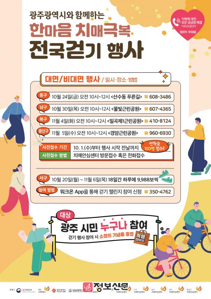 자치구별로 동구는 10월24일 푸른길분수공원에서, 남구는 10월30일 물빛근린공원, 북구는 11월4일 일곡제1근린공원, 광산구는 11월5일 경암근린공원에서 걷기행사가 진행된다. 행사 시간은 오전 10시부터이며, 치매 예방에 관심 있는 시민 누구나 무료로 참여할 수 있다.