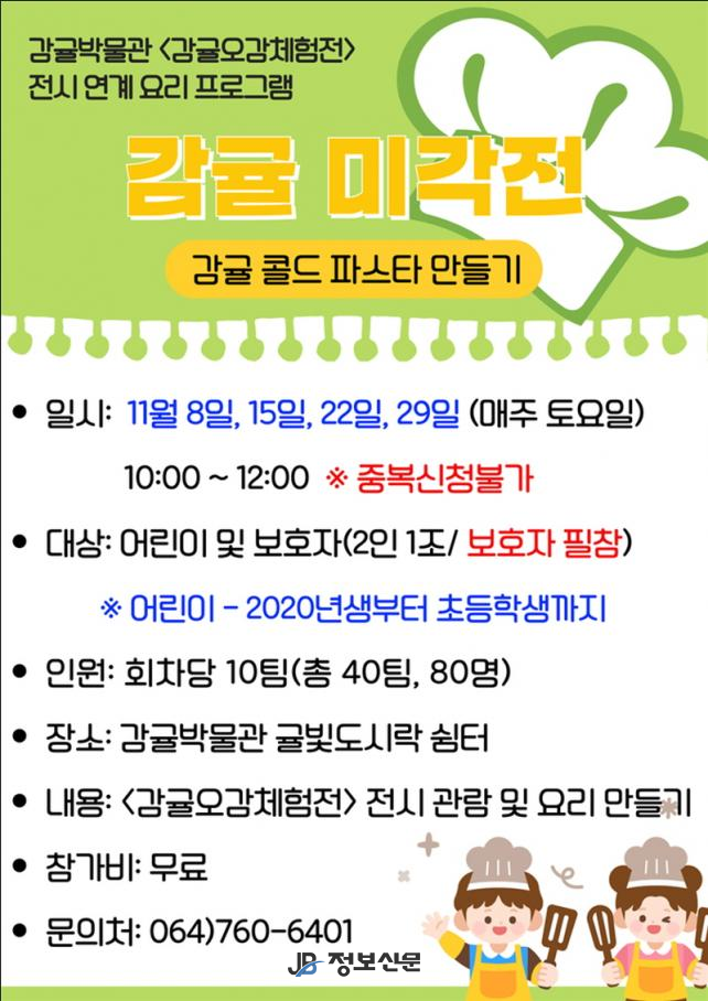 이번 프로그램은 <감귤오감체험전>의 주제인 오감(五感) 중 ‘미각’ 콘텐츠로 기획되었으며 11월 8일부터 29일까지 매주 토요일 감귤박물관 귤빛도시락 쉼터에서 진행된다. 수업은 쿠킹클래스카페 어썸 오현주 대표가 맡았으며, 참여자들은 학예사와 함께 전시를 관람한 뒤 감귤을 활용한 콜드 파스타를 직접 만들고 시식하는 시간을 갖는다.