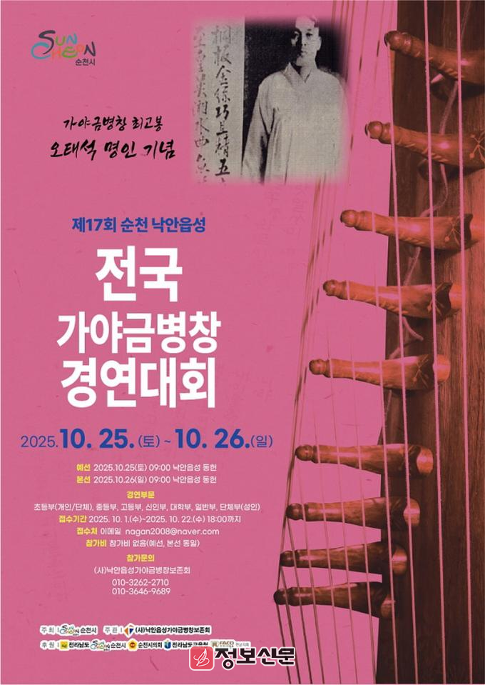 시 관계자는 “이번 낙안읍성 가야금병창 경연대회가 단순한 실력을 겨루는 경연대회를 넘어 참가자들이 서로의 예술적 열정과 기량을 나누고 교감할 수 있는 소중한 자리가 될 것”이라며 “가야금병창의 저변 확대와 유능한 인재 발굴을 위해 지속적으로 노력하겠다”고 말했다.