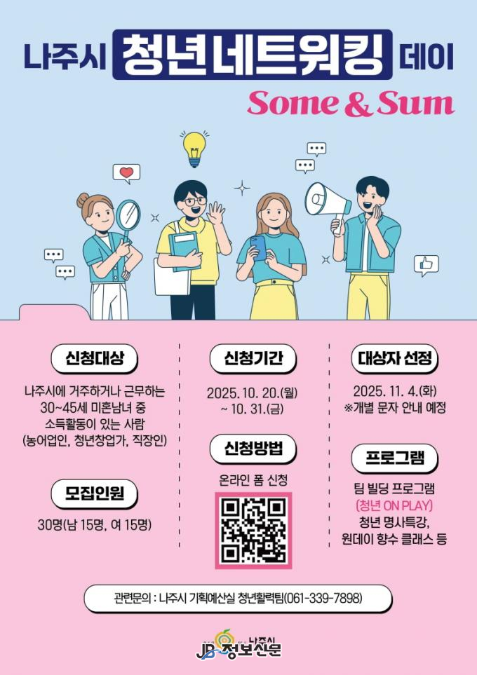 ![]() 나주시, 미혼청년 위한 ‘청년 네트워킹 데이’ 참가자 모집 |