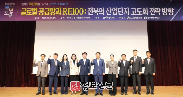 전북연구원은 지난 23일 오전 8시, 전북특별자치도청 대회의실에서 「전북 백년포럼」 제41강을 개최하였다. 이번 포럼은 ‘글로벌 공급망과 RE100: 전북의 산업단지 고도화 전략 방향’을 주제로, 홍콩과기대(광저우) 류하늬 연구원이 강연을 진행했다.