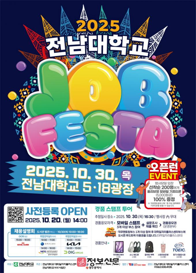 전남대 대학일자리플러스센터(센터장 정난희 교수)는 오는 10월 30일(목) 전남대학교 5·18광장 일대에서 ‘2025 전남대학교 JOB FESTA’를 개최한다고 24일 밝혔다.
