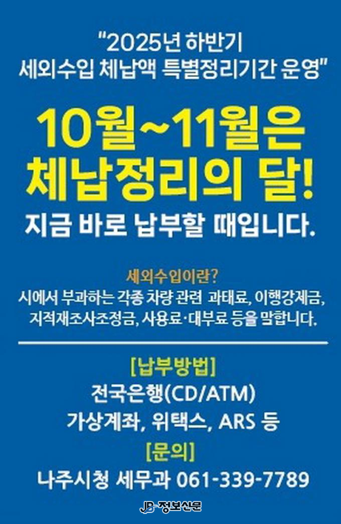 나주시 관계자는 “세외수입은 지방세와 함께 지역 발전을 위한 주요 재원”이라며 “경제 여건을 고려한 맞춤형 체납 관리로 시민 부담을 줄이고 공정한 납세 문화 확립과 건전한 재정 운영에 최선을 다하겠다”고 말했다.